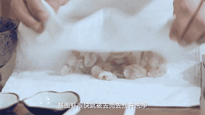 4、基围虾加料酒随后加入蛋清,最后加生粉;