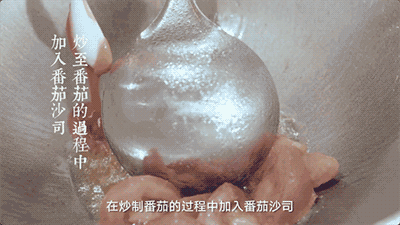 8、在炒制番茄的过程中加入番茄沙司,再加入对虾翻炒;