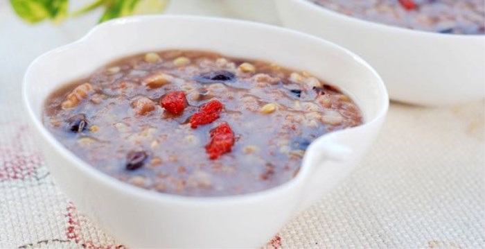 桂圆性温味甘,益心脾,补气血;具有良好的滋养补益作用。因此,这一类型的腊八粥热选桂圆为原料。此外,像红枣、花生、红豆、红糖、白果、枸杞子都是补血、温阳的好食品,可以将它们与桂圆互相搭配,连同粳米一起煮腊八粥喝,是很好的驱寒保暖良方。