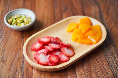 2、开心果去壳,糖水黄桃切成小块,冷冻好的草莓取出切片。