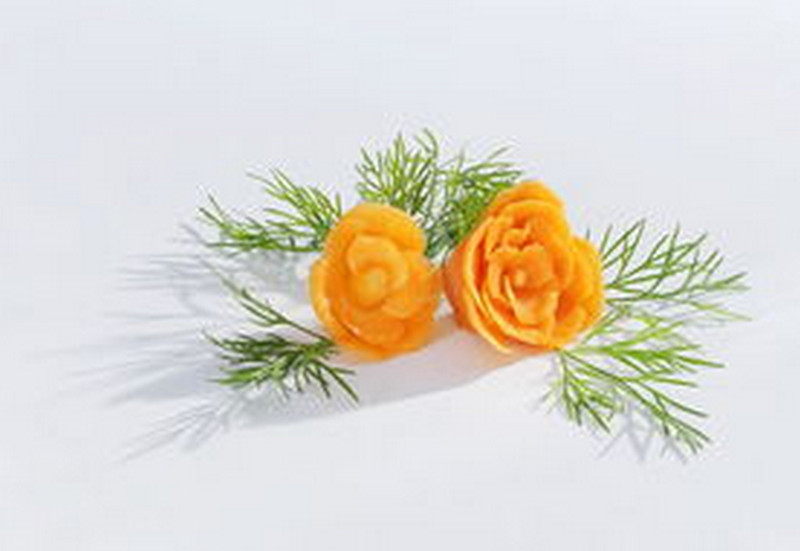 胡萝卜经常被刻成花朵或者各样的动物形态。其中花朵可用专业的模具搞定。