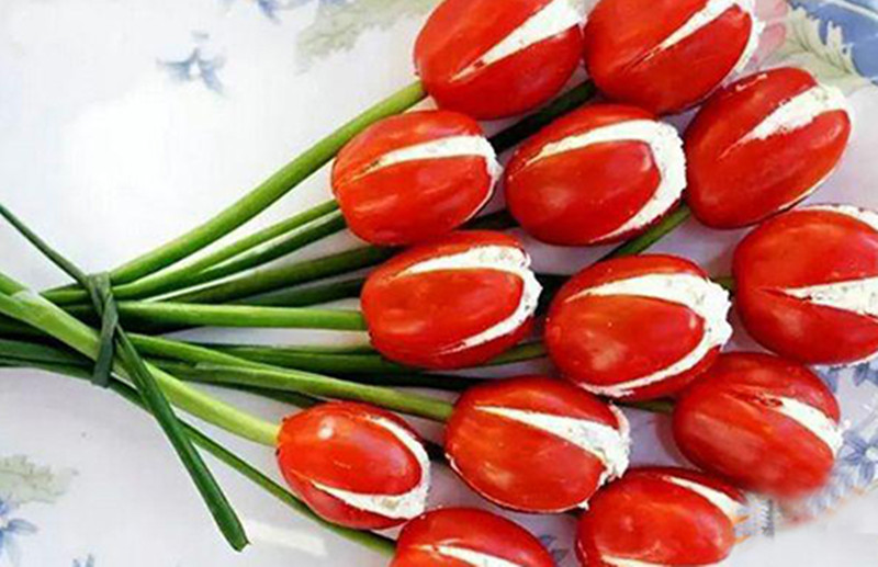 圣女果,作为盘式存在与盘子中基本不是以整粒果实存在,它往往是被切开两瓣,亦或切开成花瓣样式,搭配其他辅料而成。