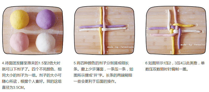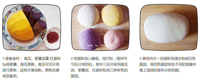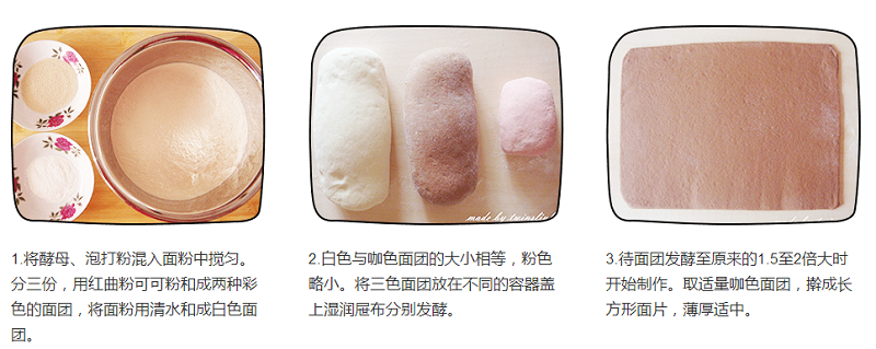 准备材料:普通面粉 500克,酵母 4克,无铝泡打粉 1克,红曲粉、可可粉、食用色素适量