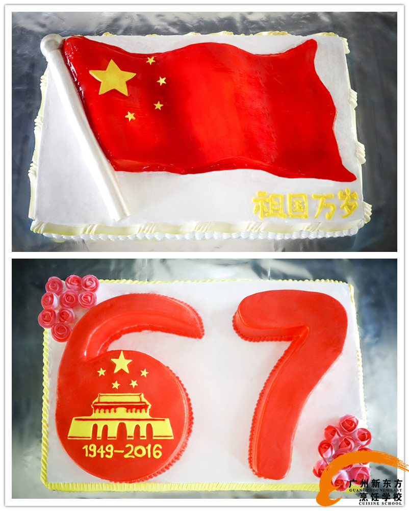 在祖国67周年盛世华诞来临之际,广州新东方烹饪学校的学子和老师们将千言万语的祝福,化作精致美丽的蛋糕祝愿祖国母亲生日快乐!