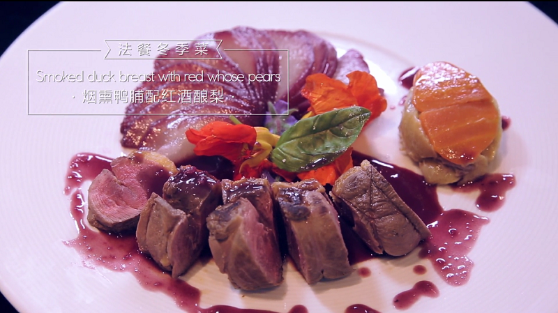 法餐冬季食材互换料理——烟熏鸭脯配红酒酿梨,精选优质鸭脯肉为主材,采用独特的香料烟熏工艺,炮制出别具一格的风味,再搭配先炖后烤的鸭腿肉和红酒炖雪梨,营造出层次分明的不俗口感。冬季食用,可生津补血、暖胃润肺、滋养肌肤,是一道广受青睐的经典法餐。