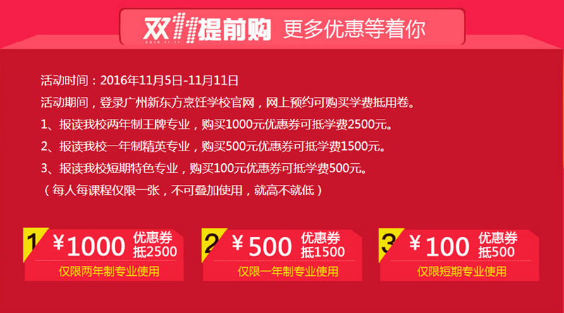 截止到2016年11月11日,来广州新东方烹饪学校报名,都能享受现金直接抵学费优惠!