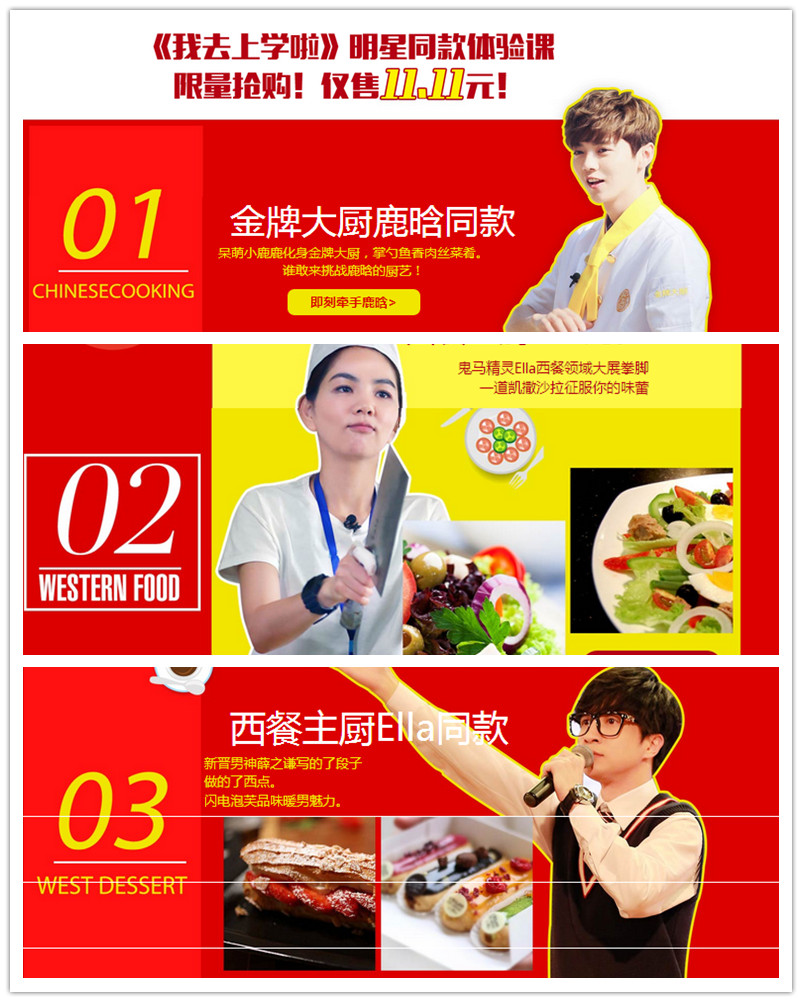 活动期间,登录广州新东方烹饪学校官网,官方微信等平台,参与双11活动,购买明星同款体验课