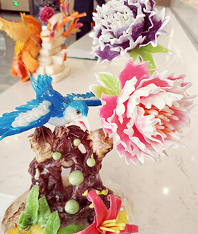 糖艺特色班学习新糖艺配方,老师详细讲解熬糖、拉糖、吹糖、汽泡糖、珊瑚糖、流线糖等实用盘饰的做法。内容包括学习花卉、水果篮、天鹅、龙虾、玻璃球、色彩喷绘、龙凤、鹦鹉、大型孔雀等实用装饰品的制作方法。