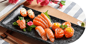 青瓜卷、天妇罗、沙拉、寿司、烧鸡肉串等。