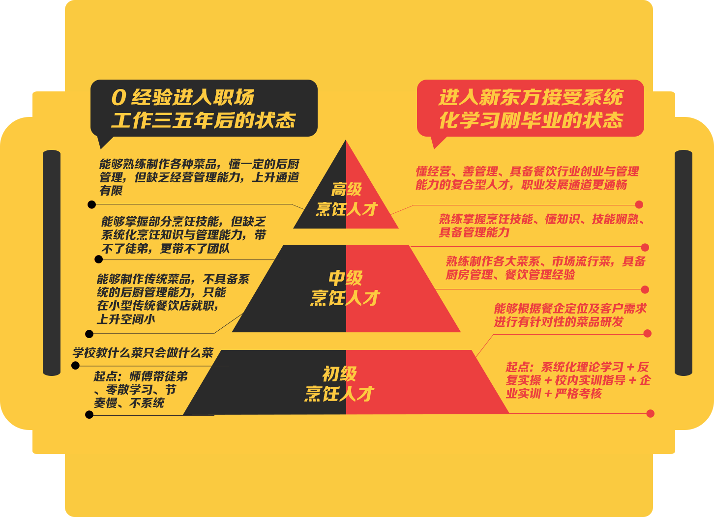 新东方办学长达35年,是中国烹饪教育的黄埔军校,往期 毕业的学员早已走上企业核心管理岗位,有不少学生自己创 业开公司,这些资源也成为现在的学生毕业后就业的重要优 势,这都是一般学校无法比拟的。